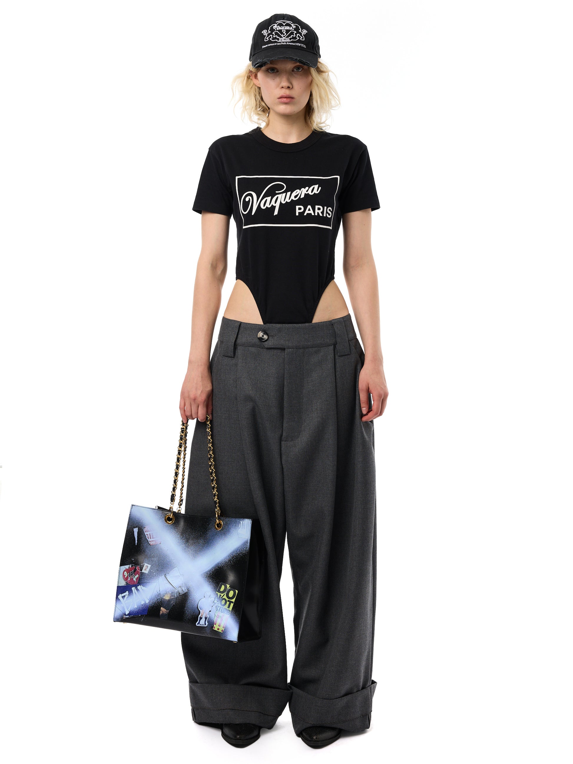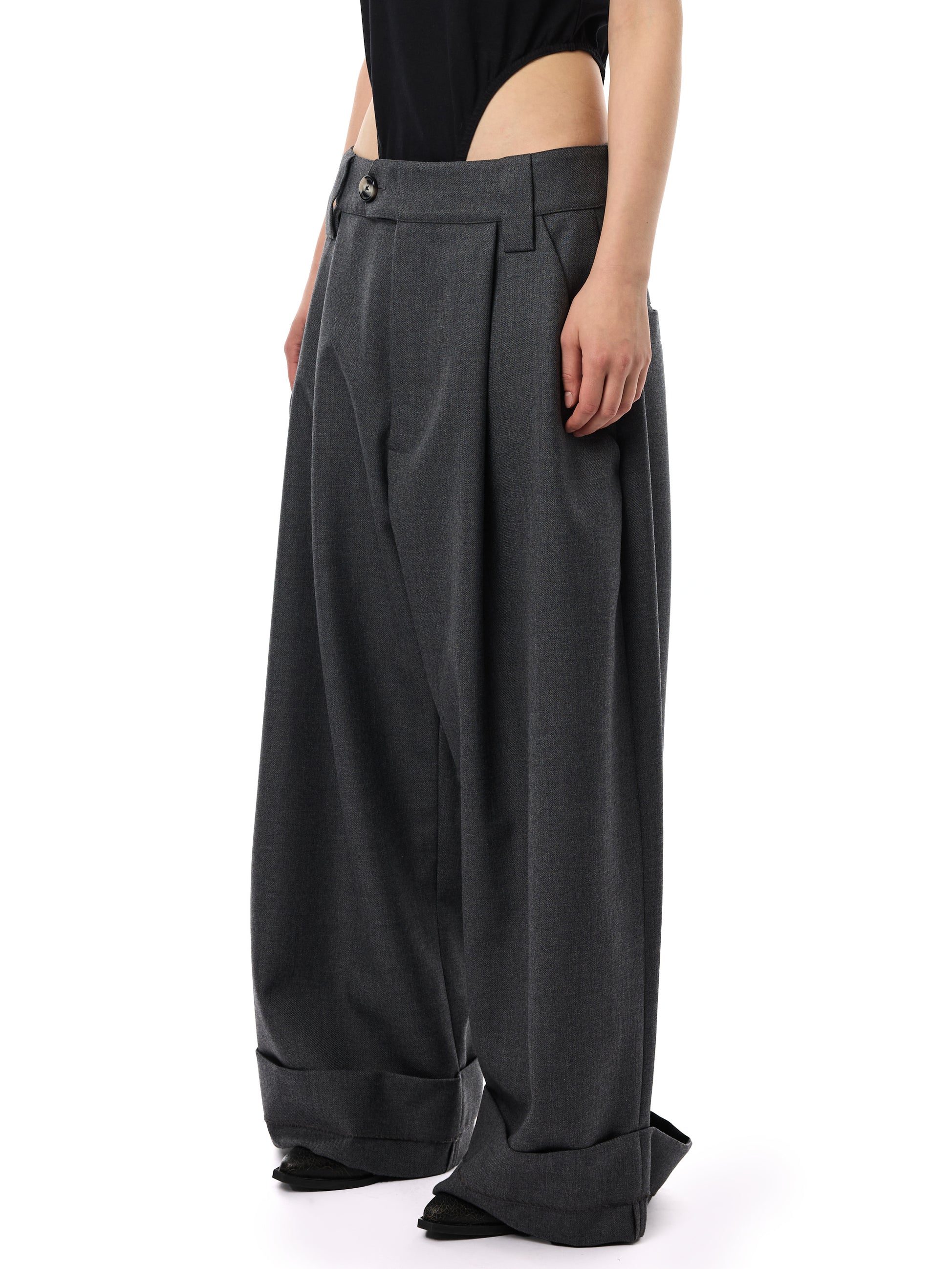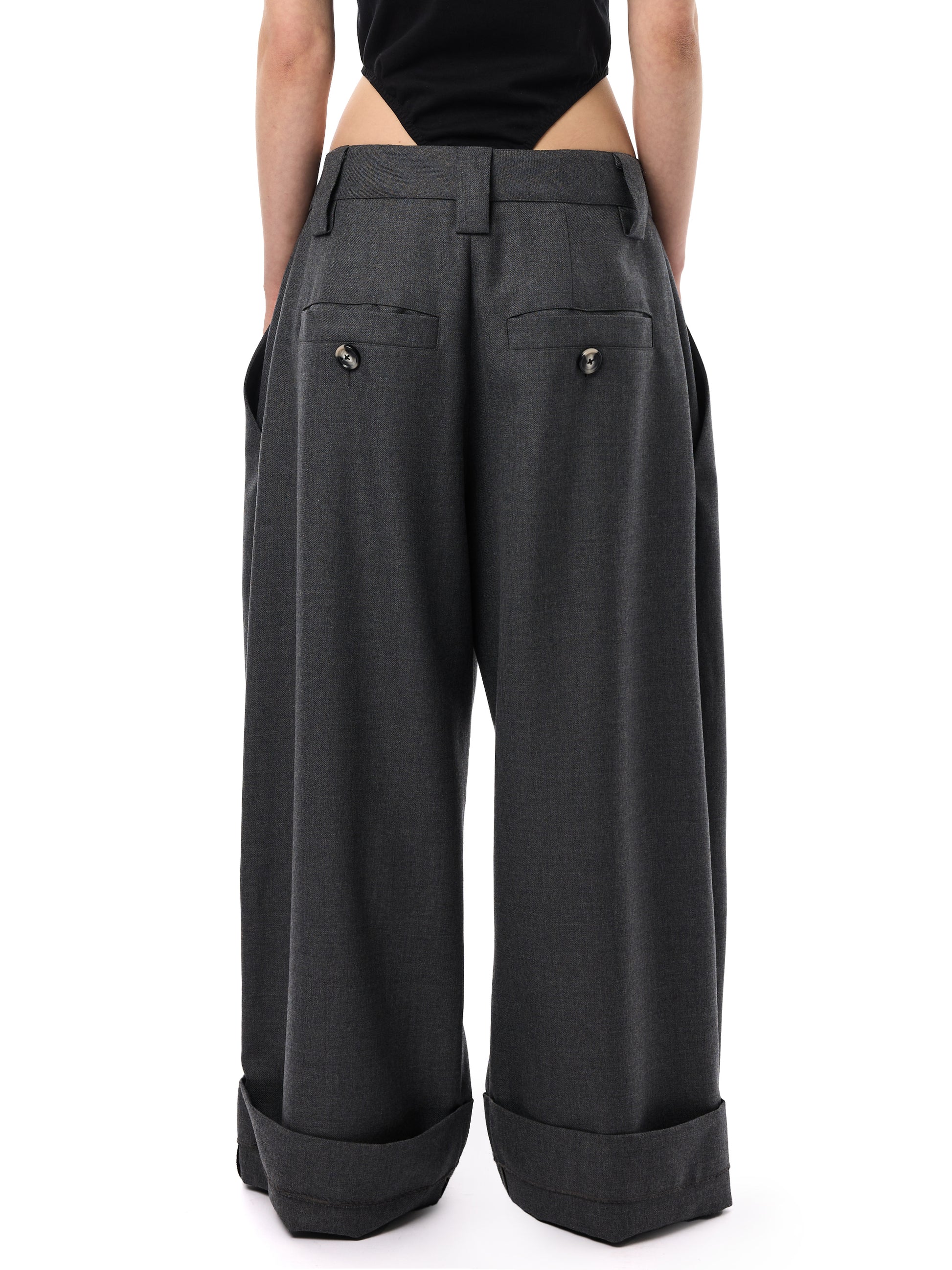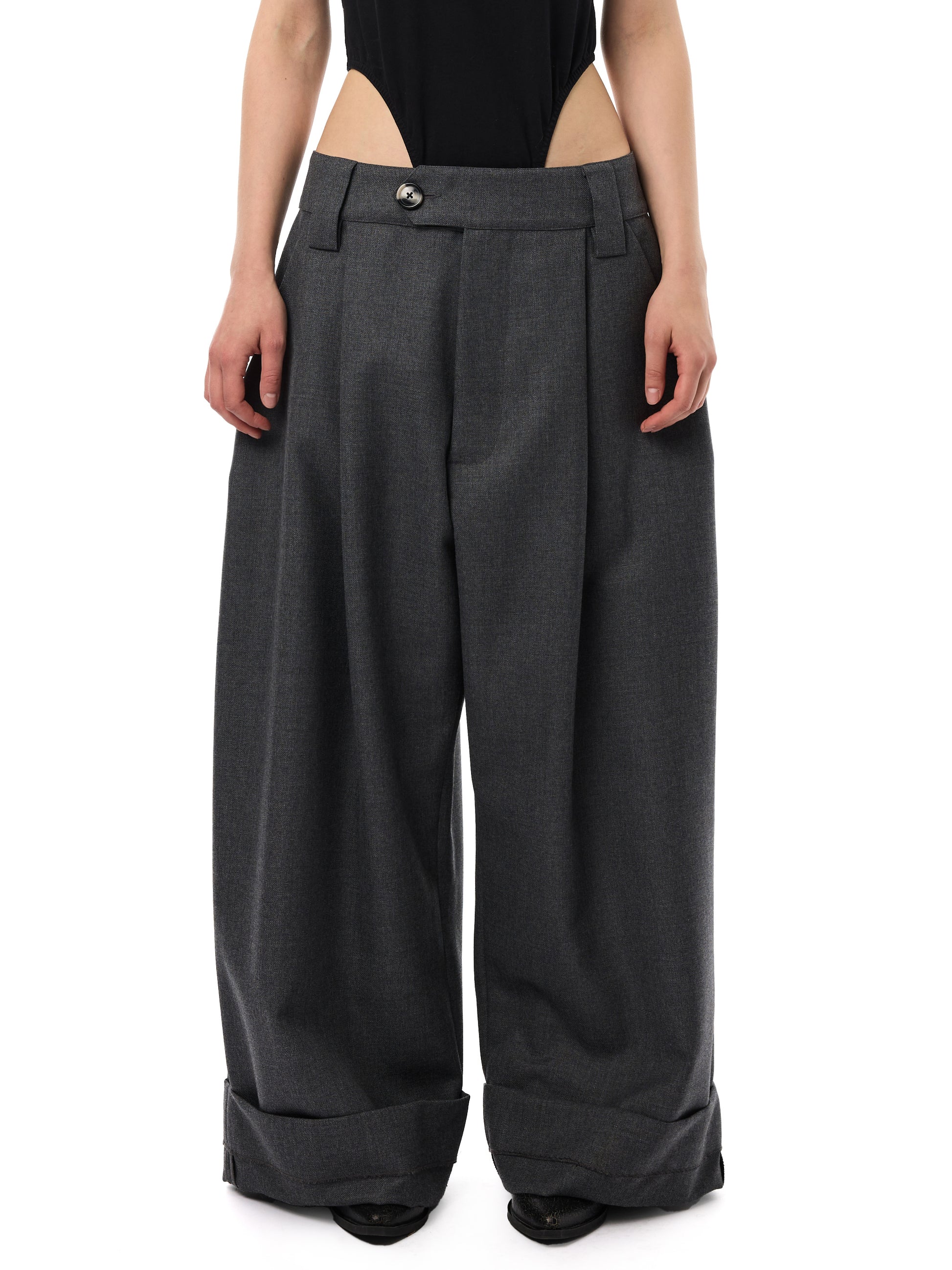 Low-rise, wide leg trousers. Features exaggerated detailing and large pleats at front. Button and zip fly closure, side pockets and back welt pockets.