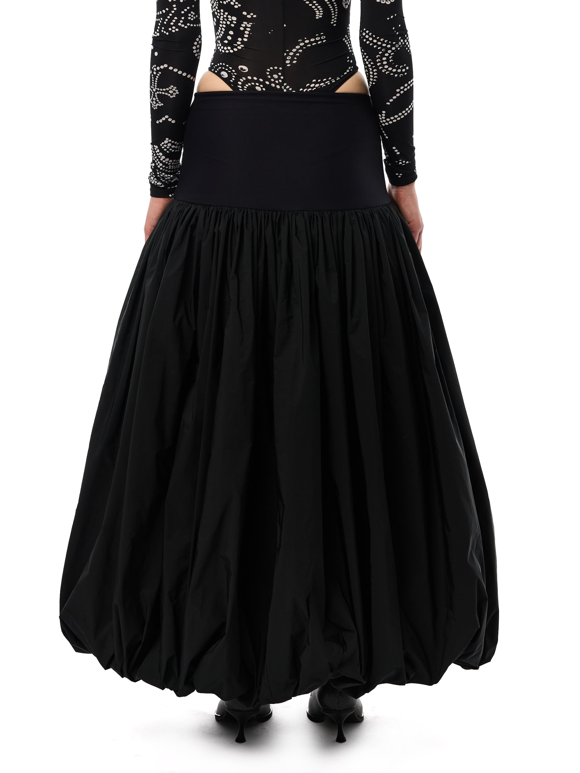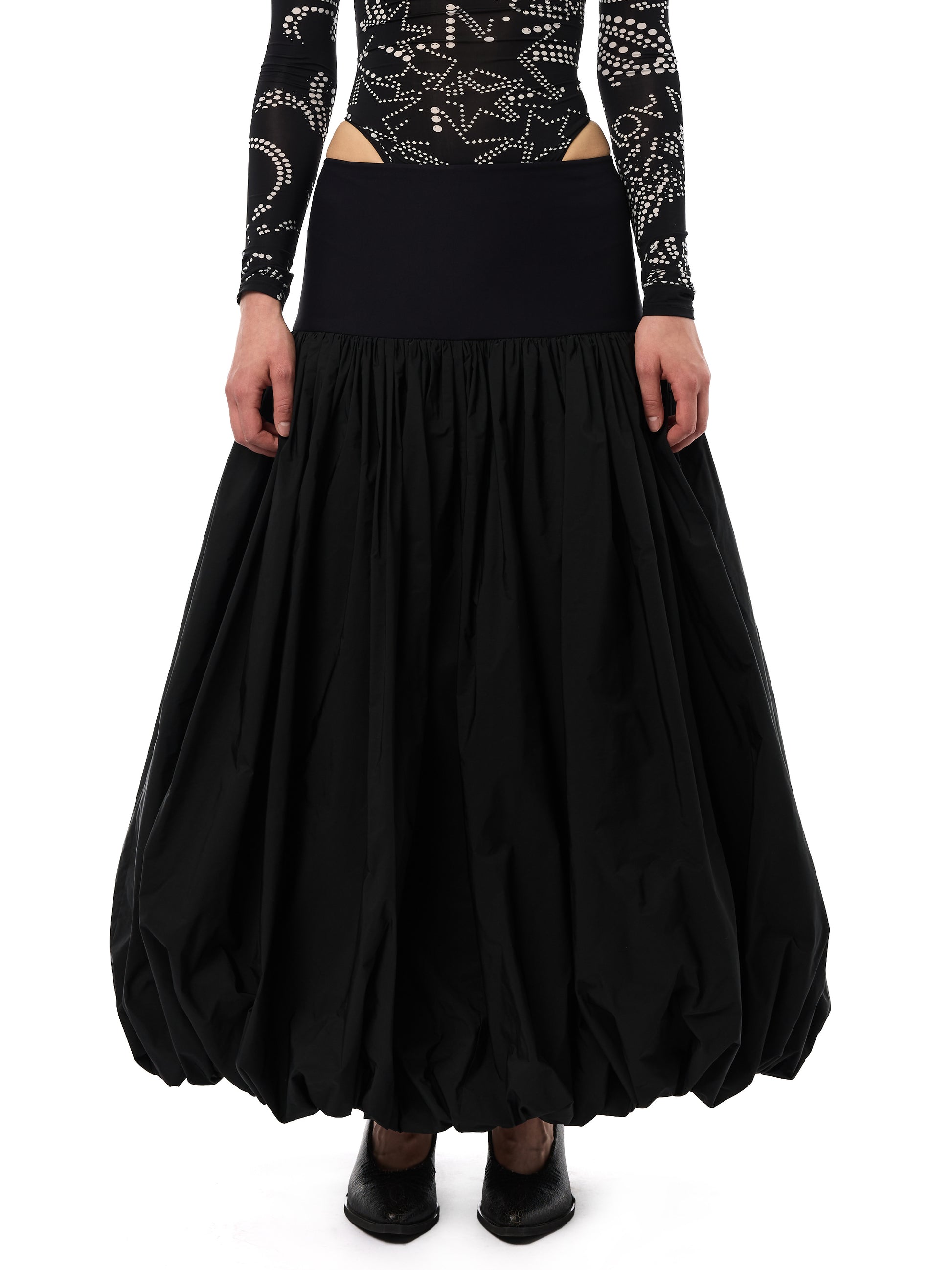 Low rise, maxi skirt with elastic waistband. Drop waist gathered bubble taffeta skirt.