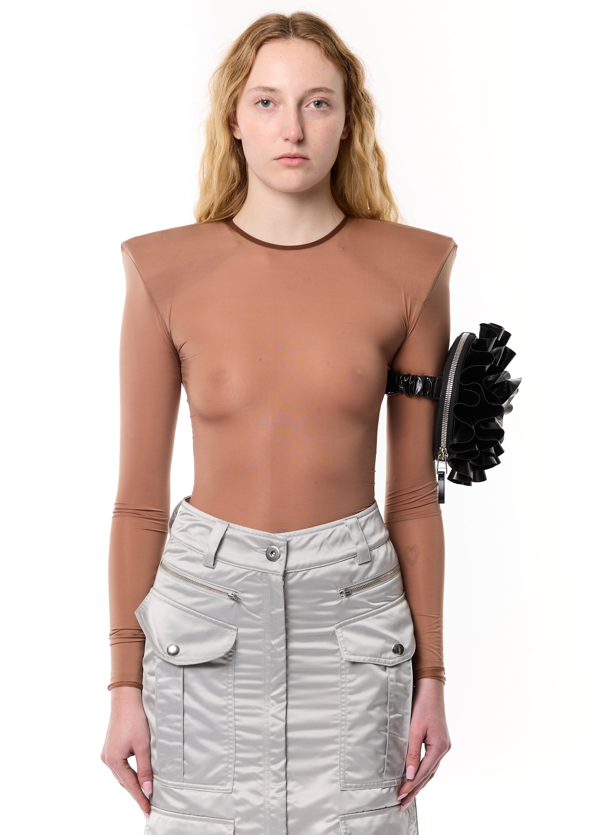BLACK LEATHER ROSETTE BAG WITH ZIPPER CLOSURE AND ADJUSTABLE buckle STRAp. Fully lined.