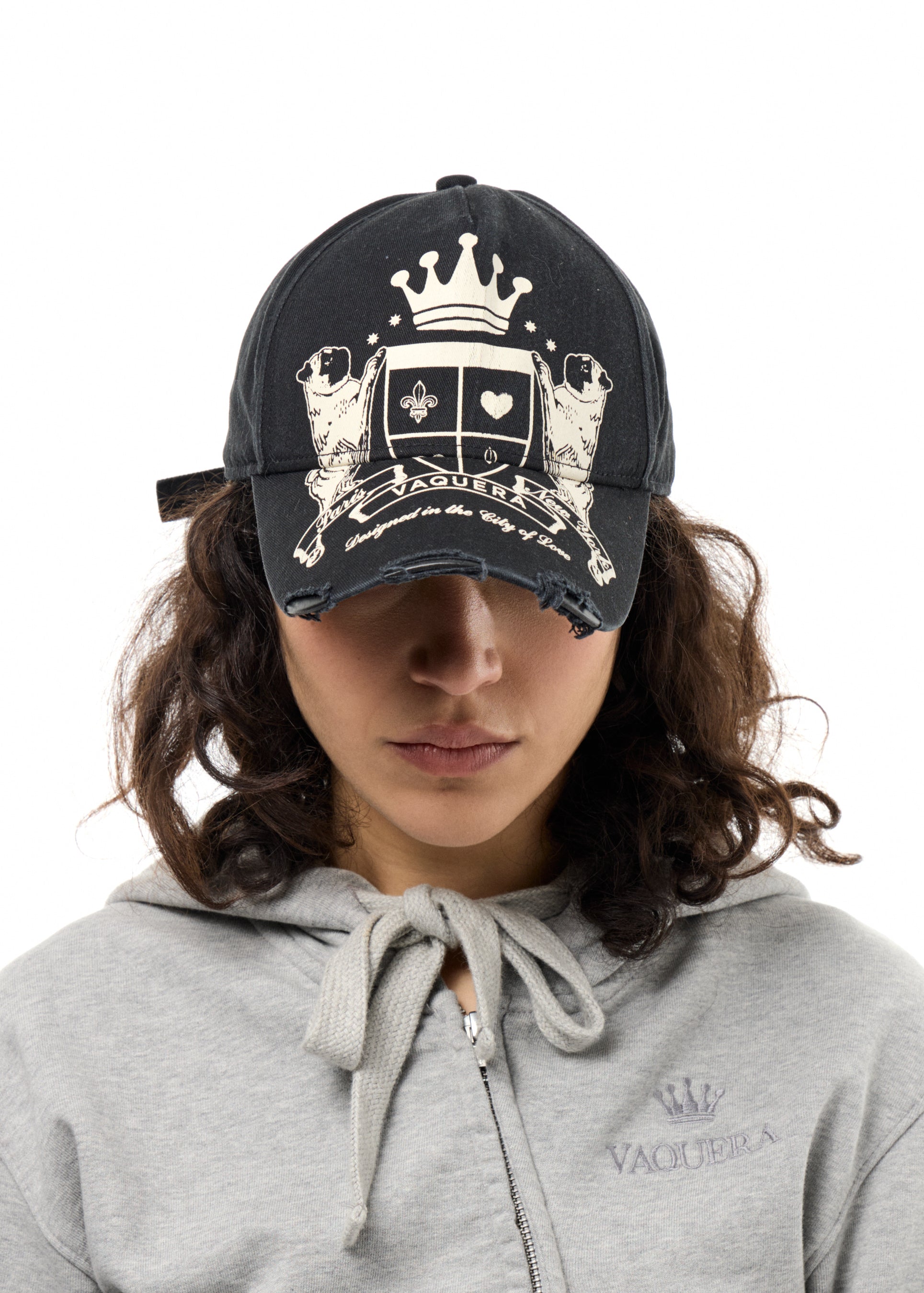 DISTRESSED BASEBALL CAP WITH VAQUERA GRAPHIC. ADJUSTABLE METAL BUCKLE CLOSURE.