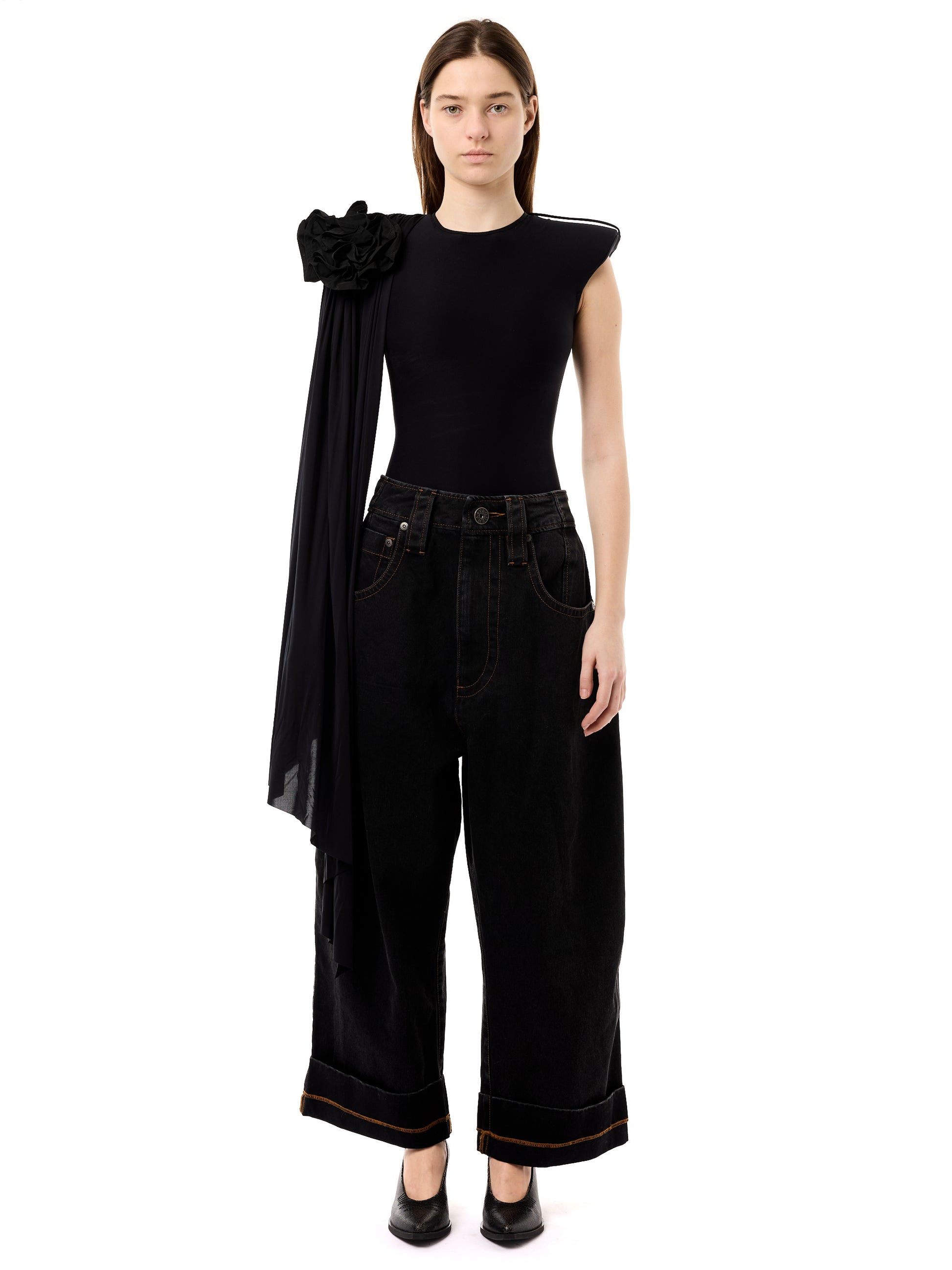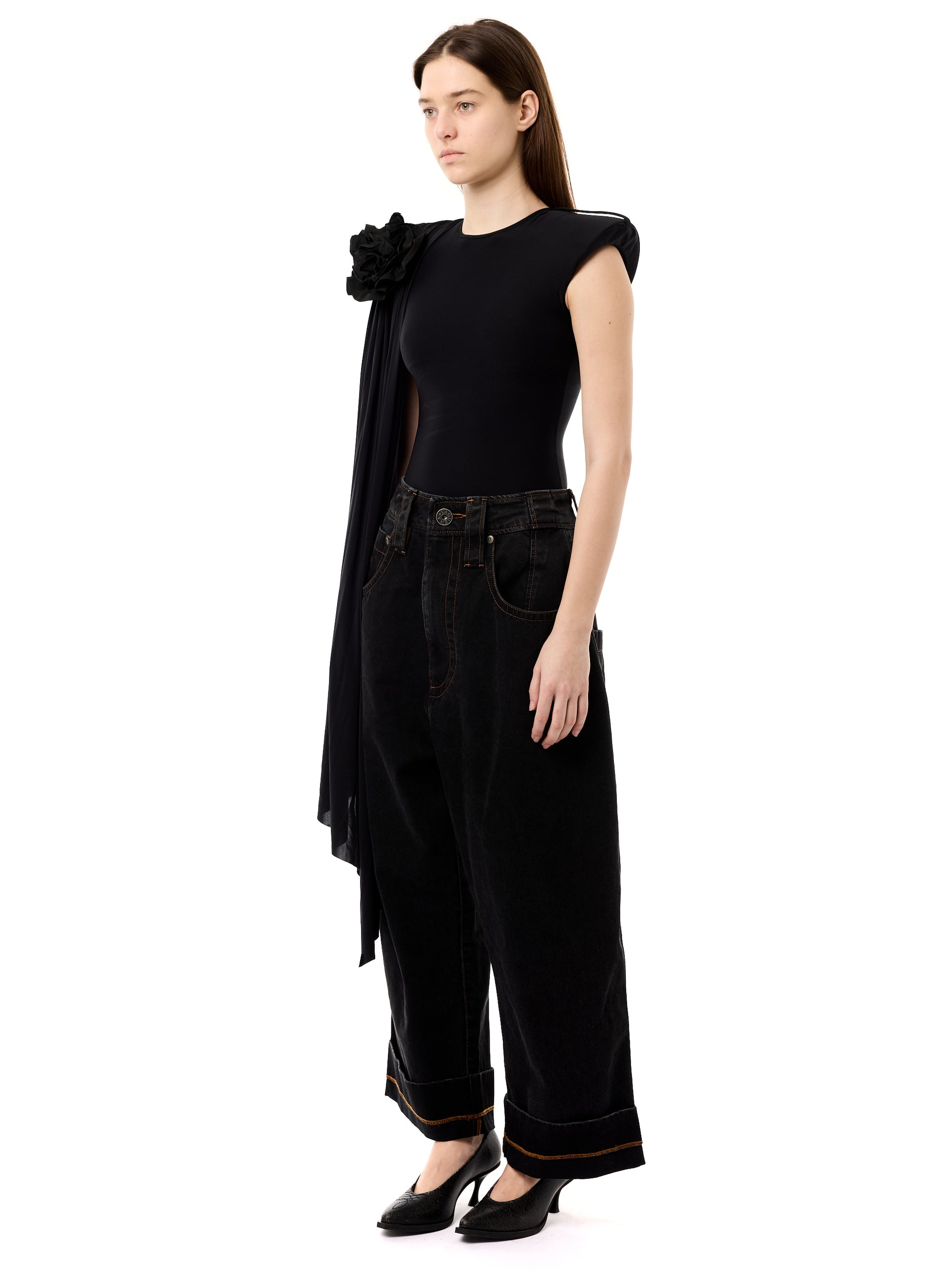 Black stretch leotard with crewneck collar. Slim fit and high cut. Gathered asymmetrical panel at right shoulder seam with ruched taffeta flower detail. Adjustable snap closure at crotch. Shoulder pads.