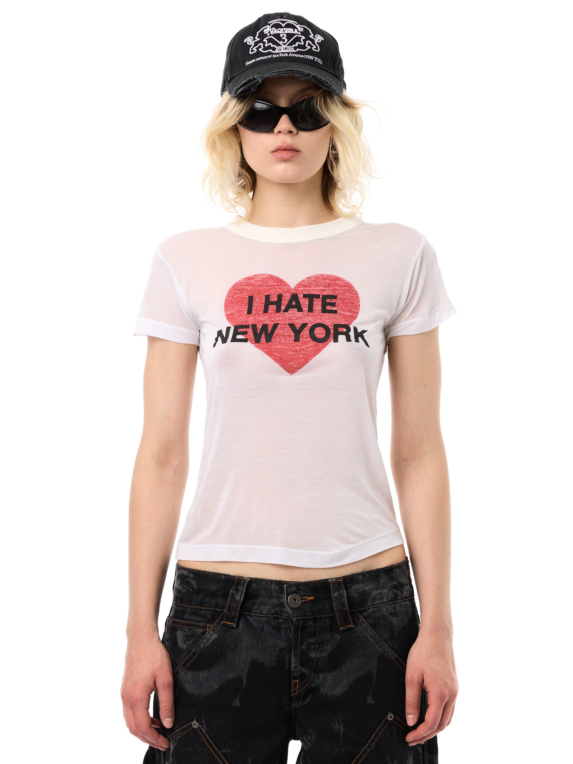 Short sleeve sheer cotton jersey tshirt in off-white. Rib knit crewneck collar. Graphic printed on the inside of tshirt that shows through to the front.