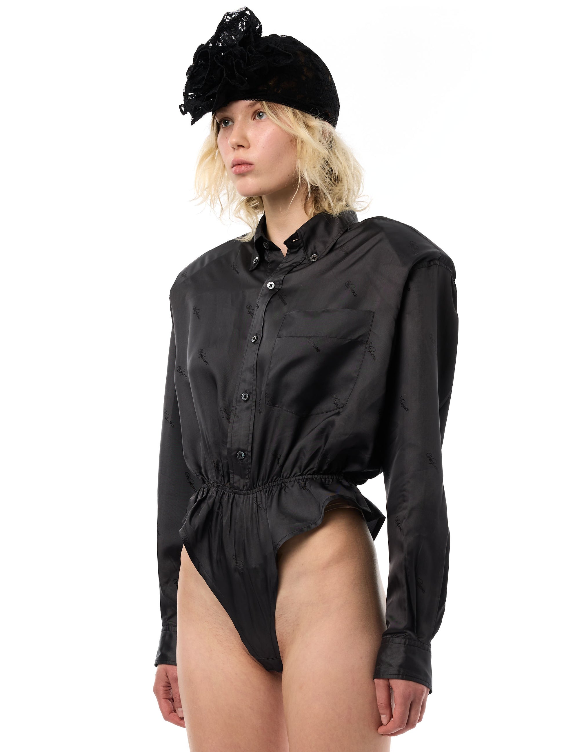 Leotard button down with classic features in Vaquera jacquard lining fabric. Elasticated waistband, patch pocket at chest, river shell pearl button closure and snap closure crotch. Detachable shoulder pads.