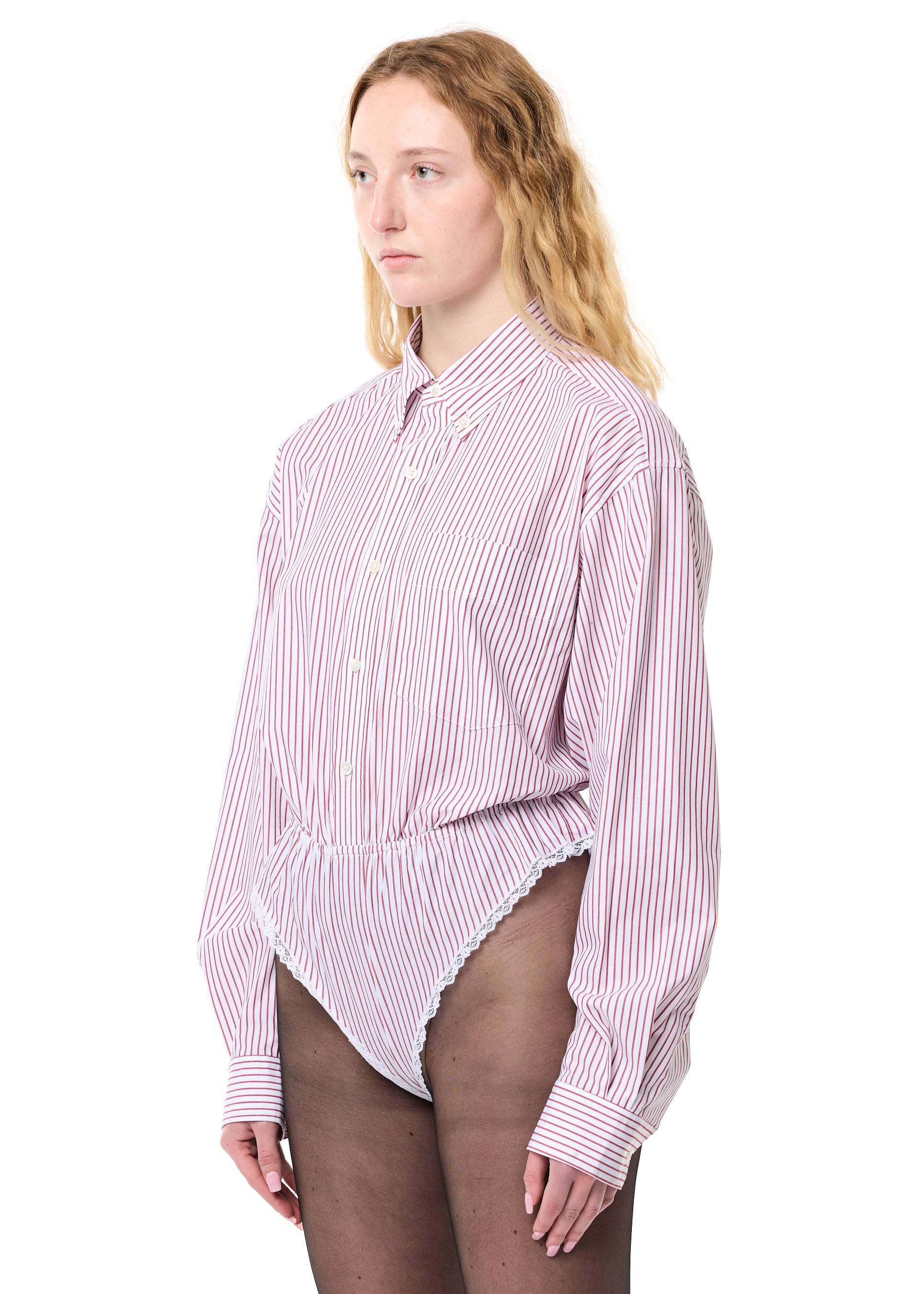 Leotard button down with classic features in red and white stripe poplin. Elasticated waistband, patch pocket at chest, river shell pearl button closure and snap closure crotch. Lace trim hem.
