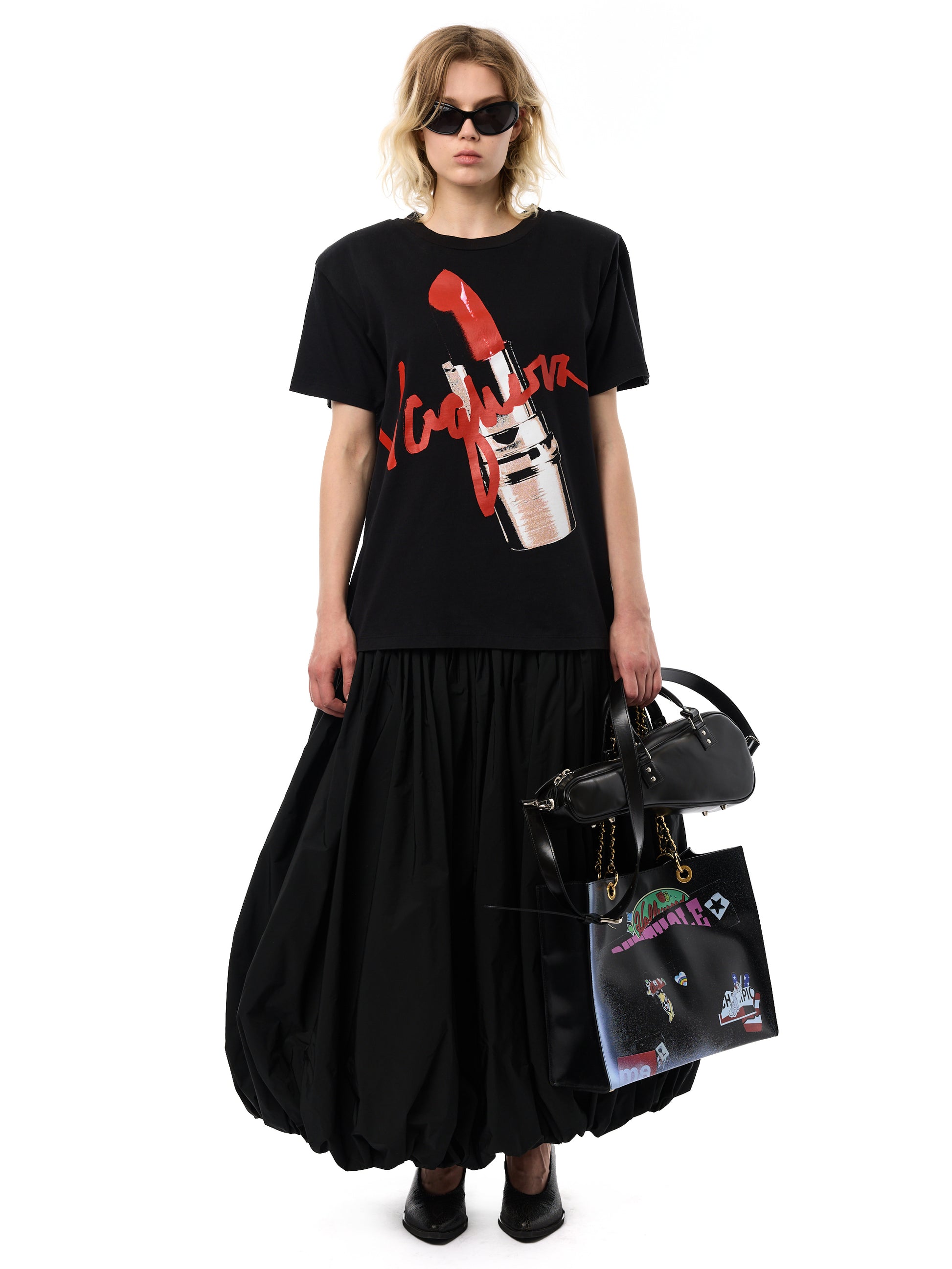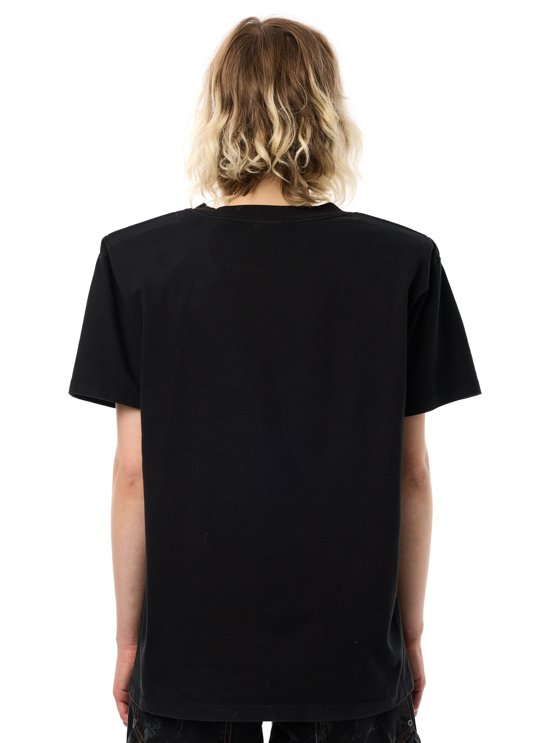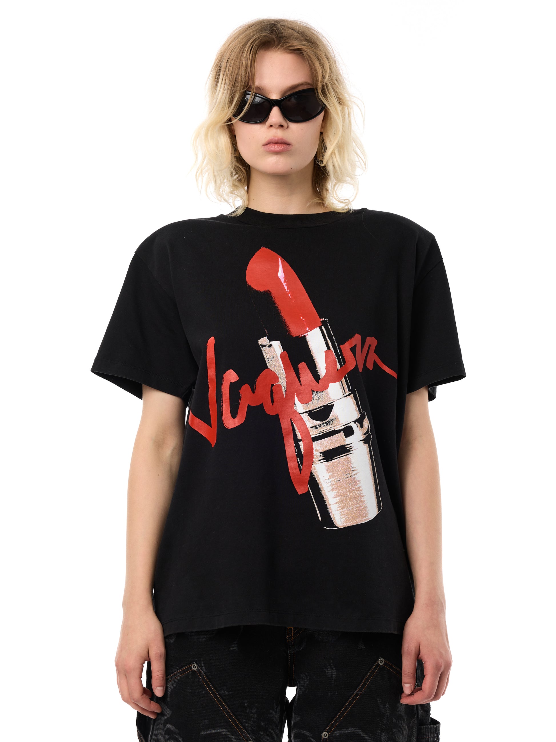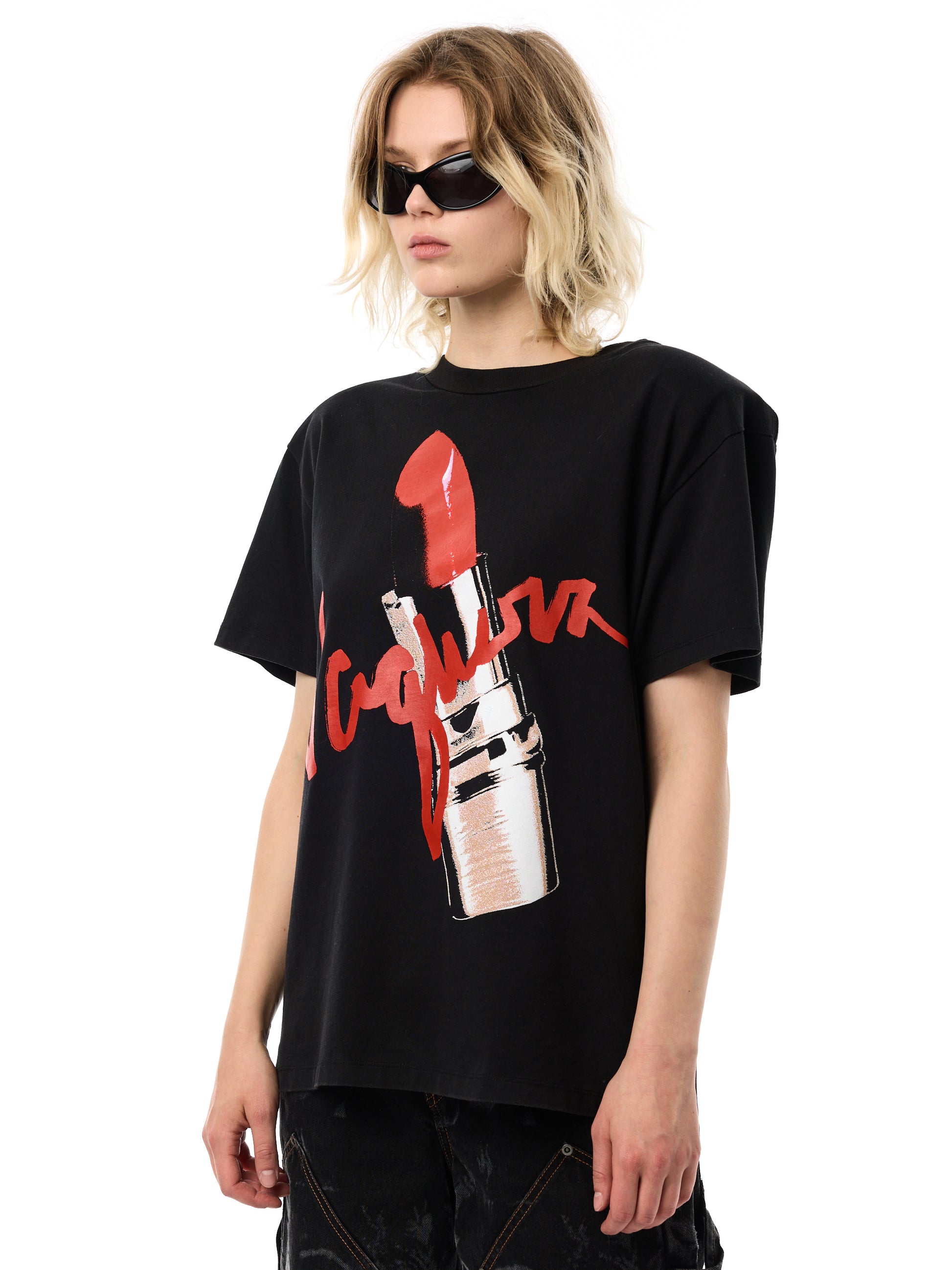 Black jersey relaxed, boxy fit tshirt with crewneck collar. Detachable shoulder pads for an exaggerated silhouette. Lipstick silk screen print on front of tshirt.