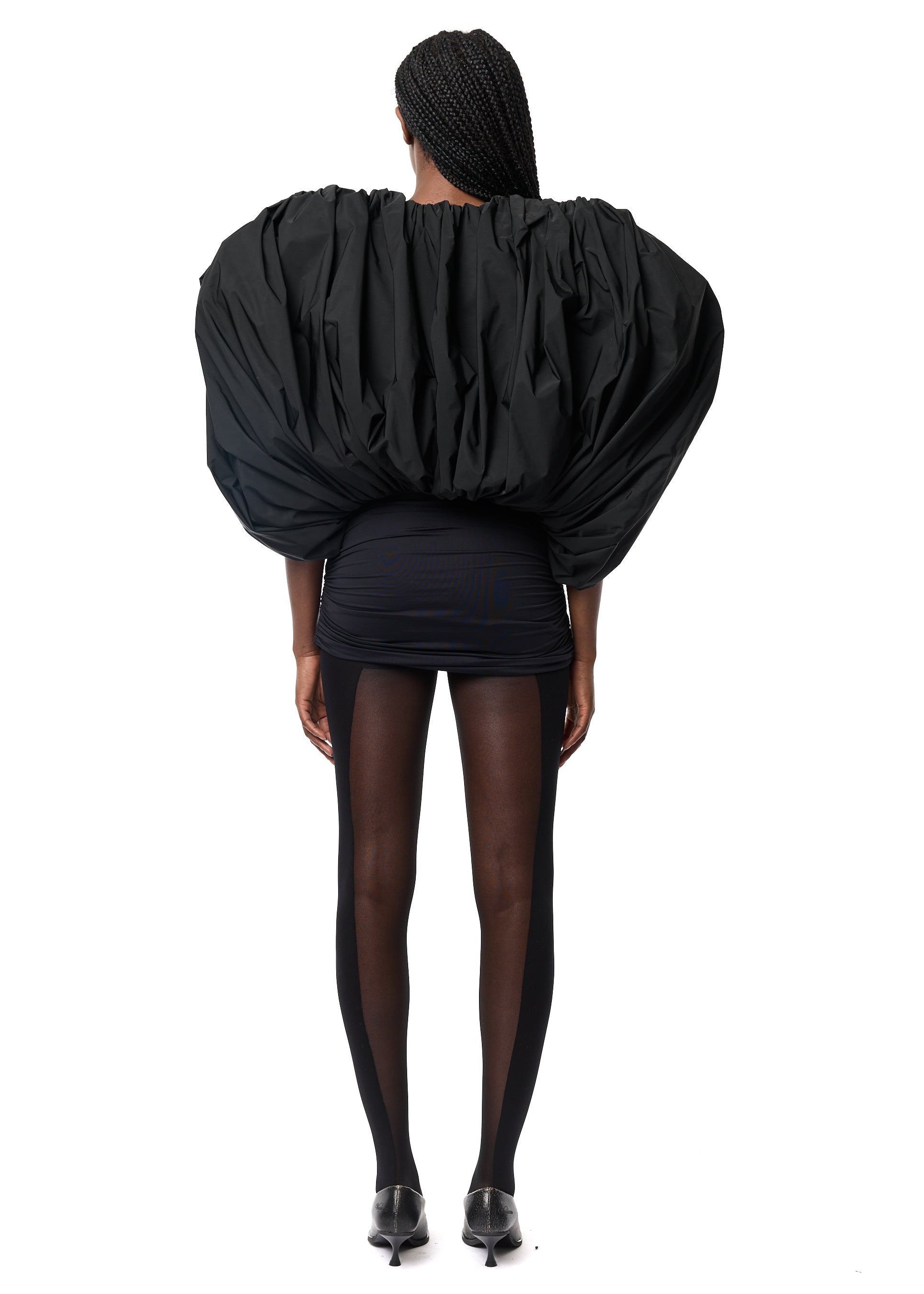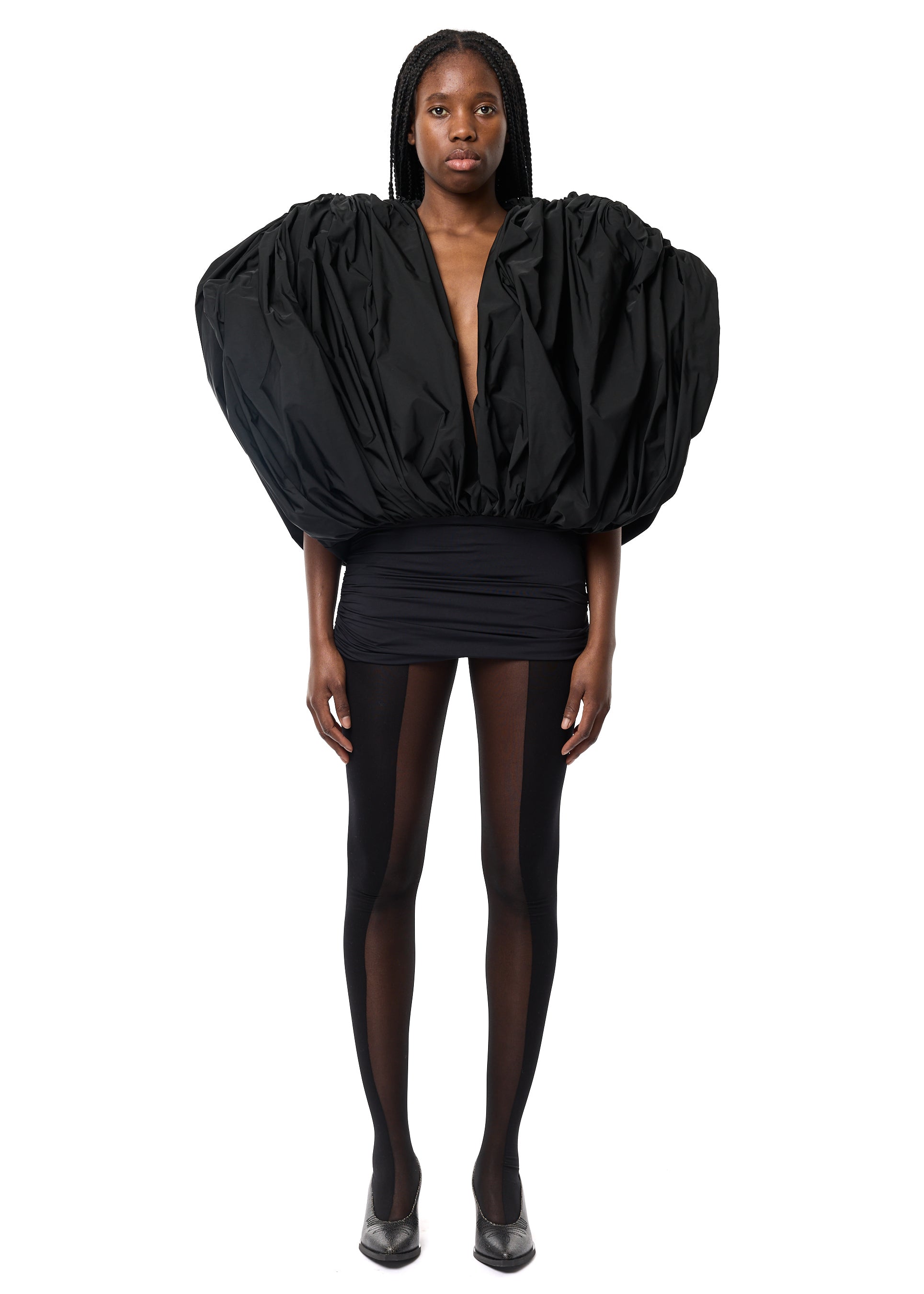Ruched black taffeta mini dress with deep v neckline. Fitted gathered stretch skirt. Shoulder Pads.