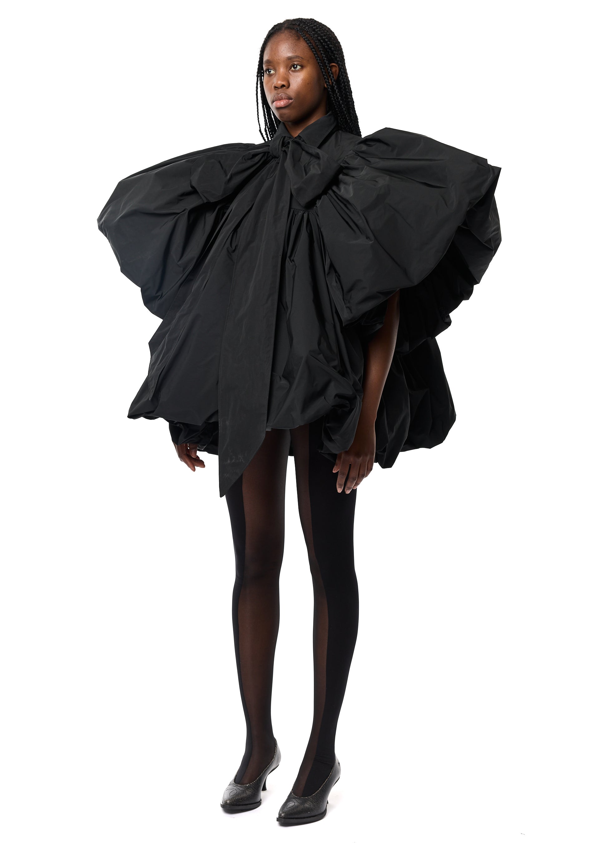 Gathered taffeta mini dress with bubbled sleeve and skirt hem. River shell button closure at collar with giant bow neck tie. Fully lined.