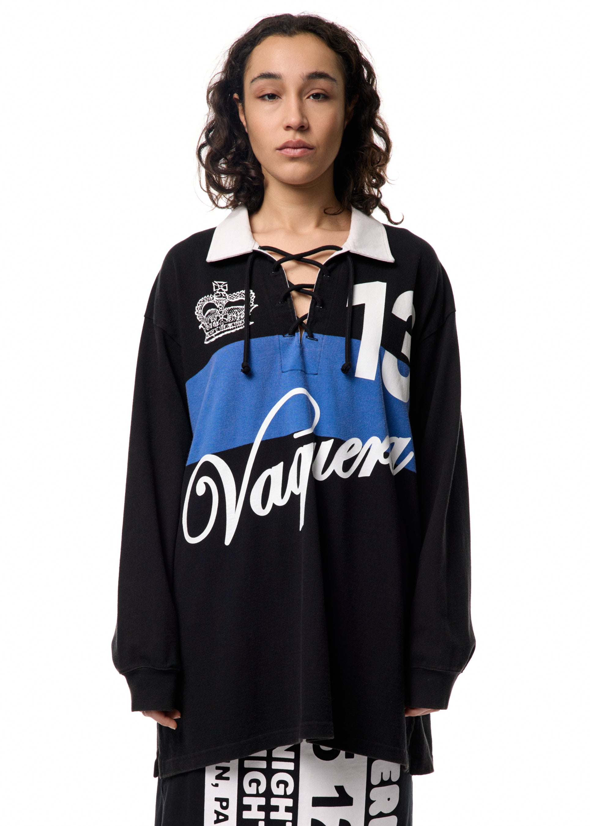 Loose fit black rugby shirt with contrast collar and lace up neckline. Graphic print on front of shirt.