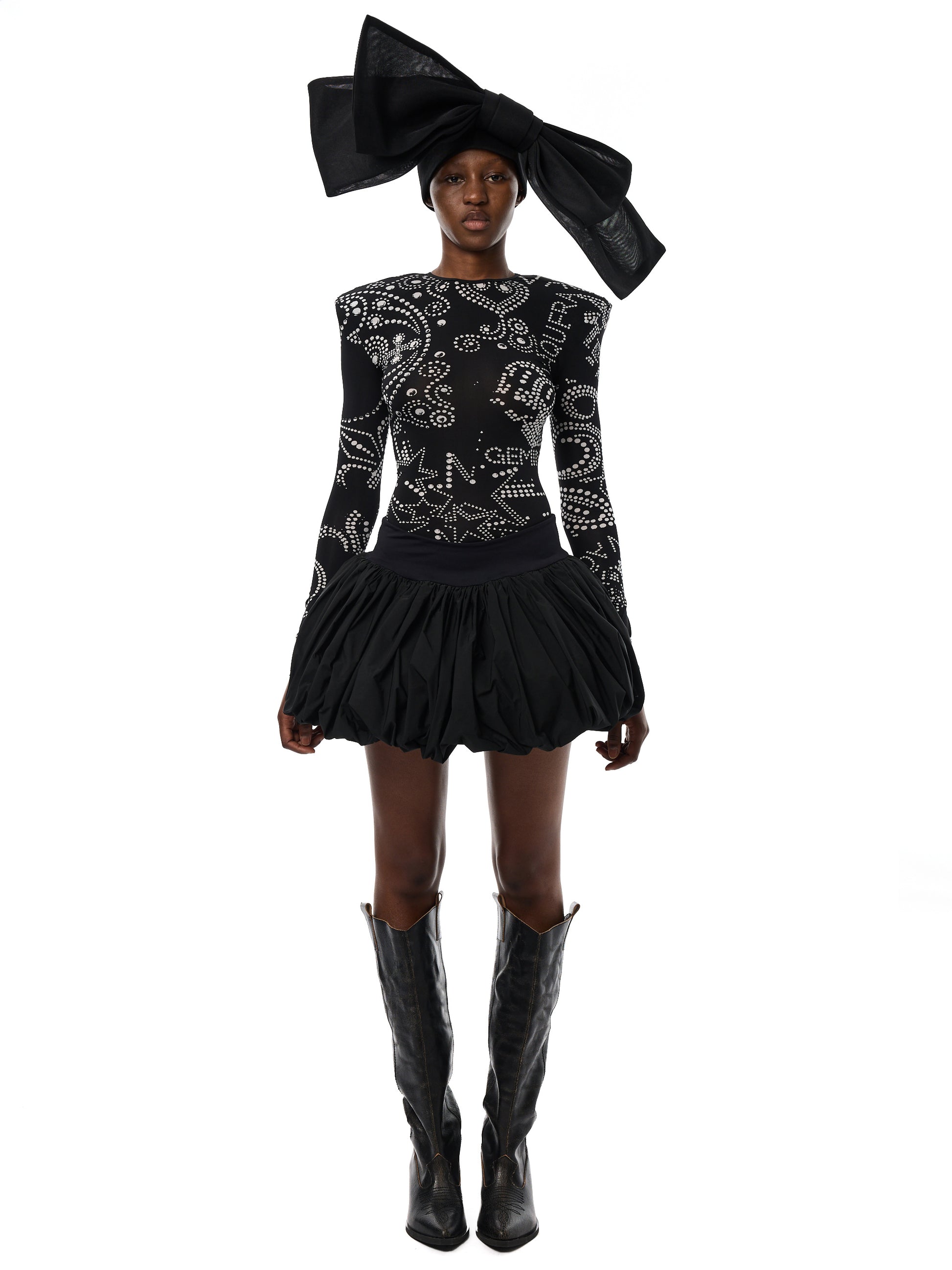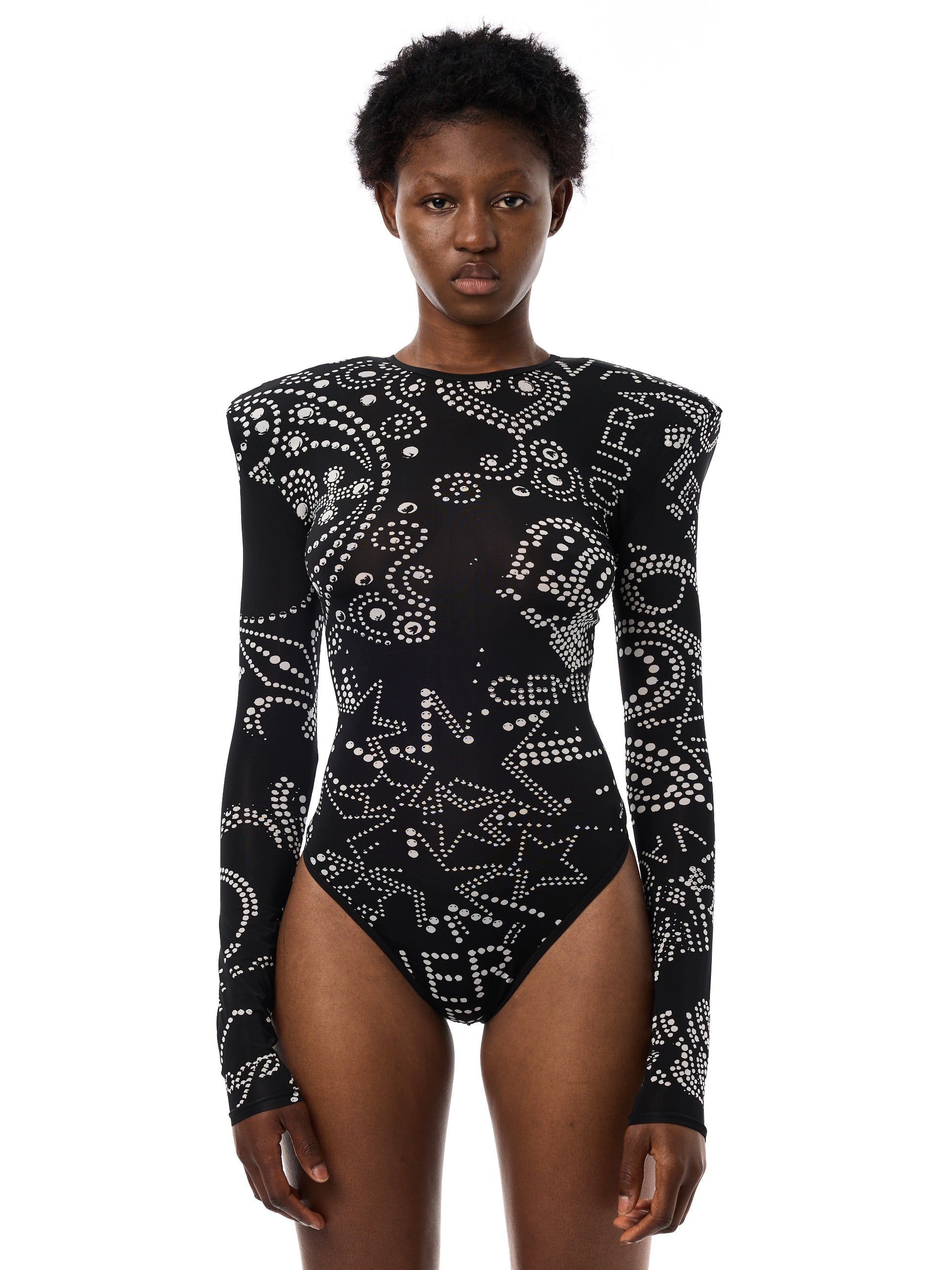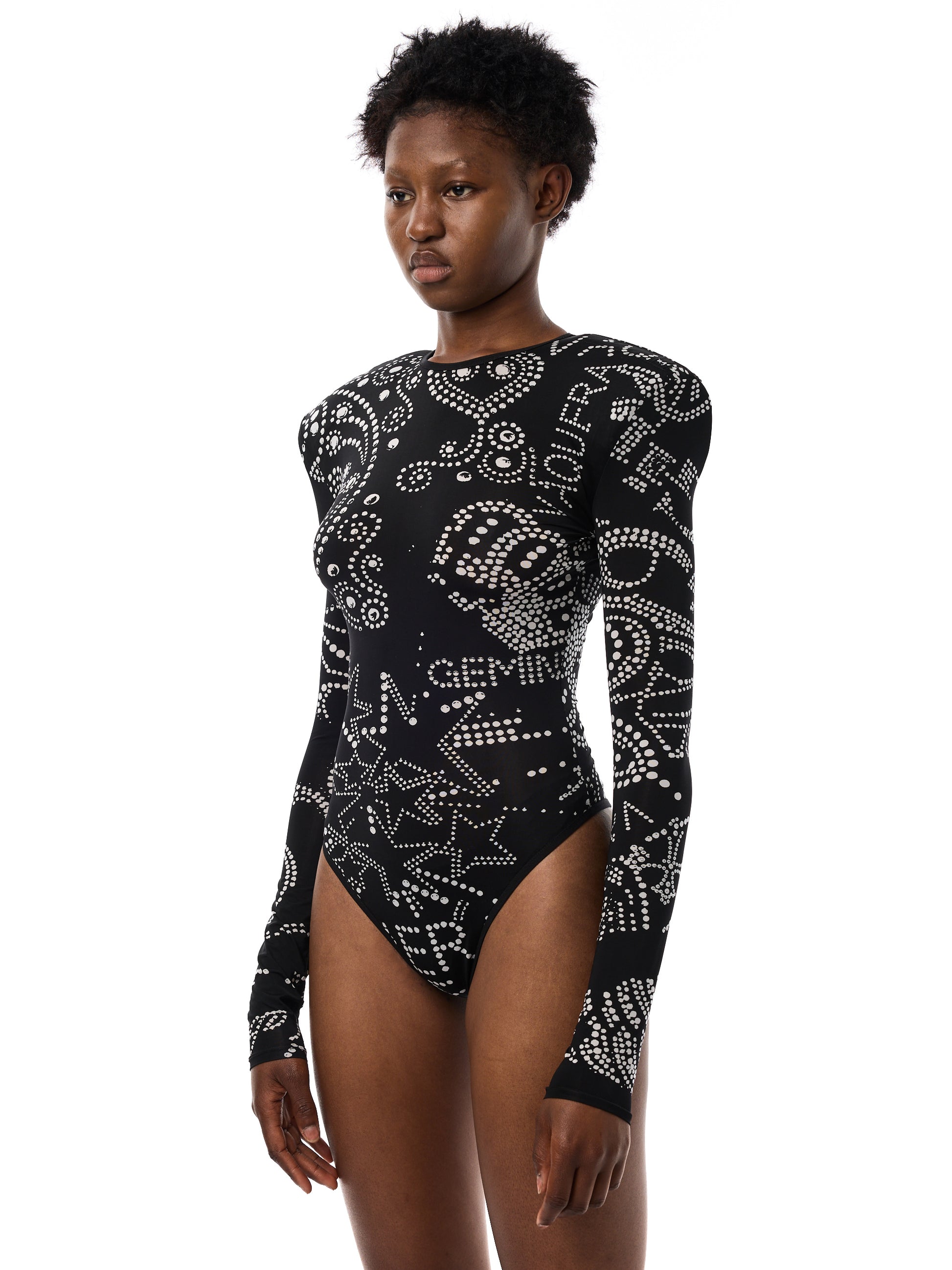 Printed stretch long sleeve leotard with crewneck collar. Slim fit and high cut. Adjustable snap closure at crotch. Shoulder pads.
