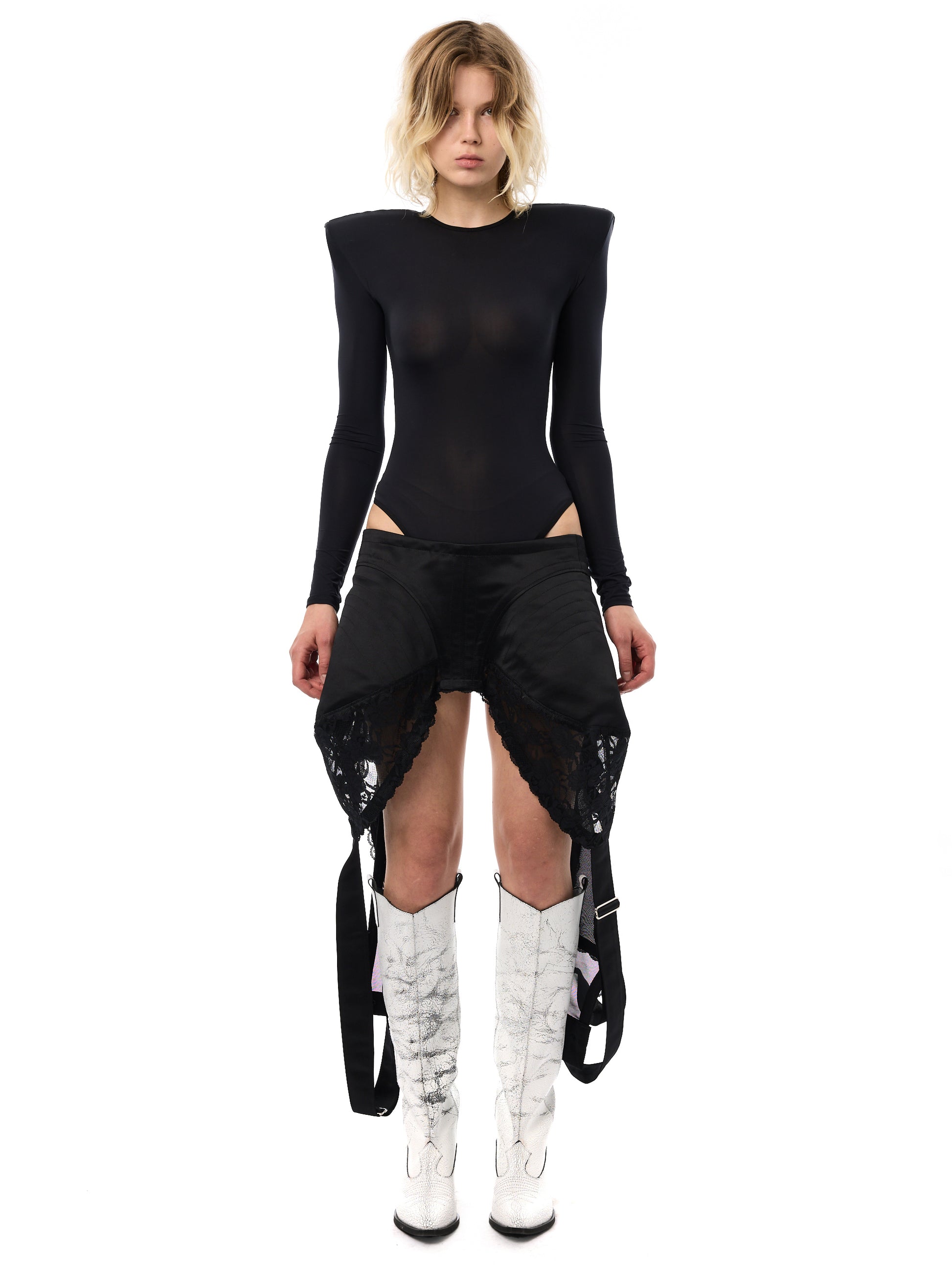 Black stretch long sleeve leotard with crewneck collar. Slim fit and high cut. Adjustable snap closure at crotch. Shoulder pads.