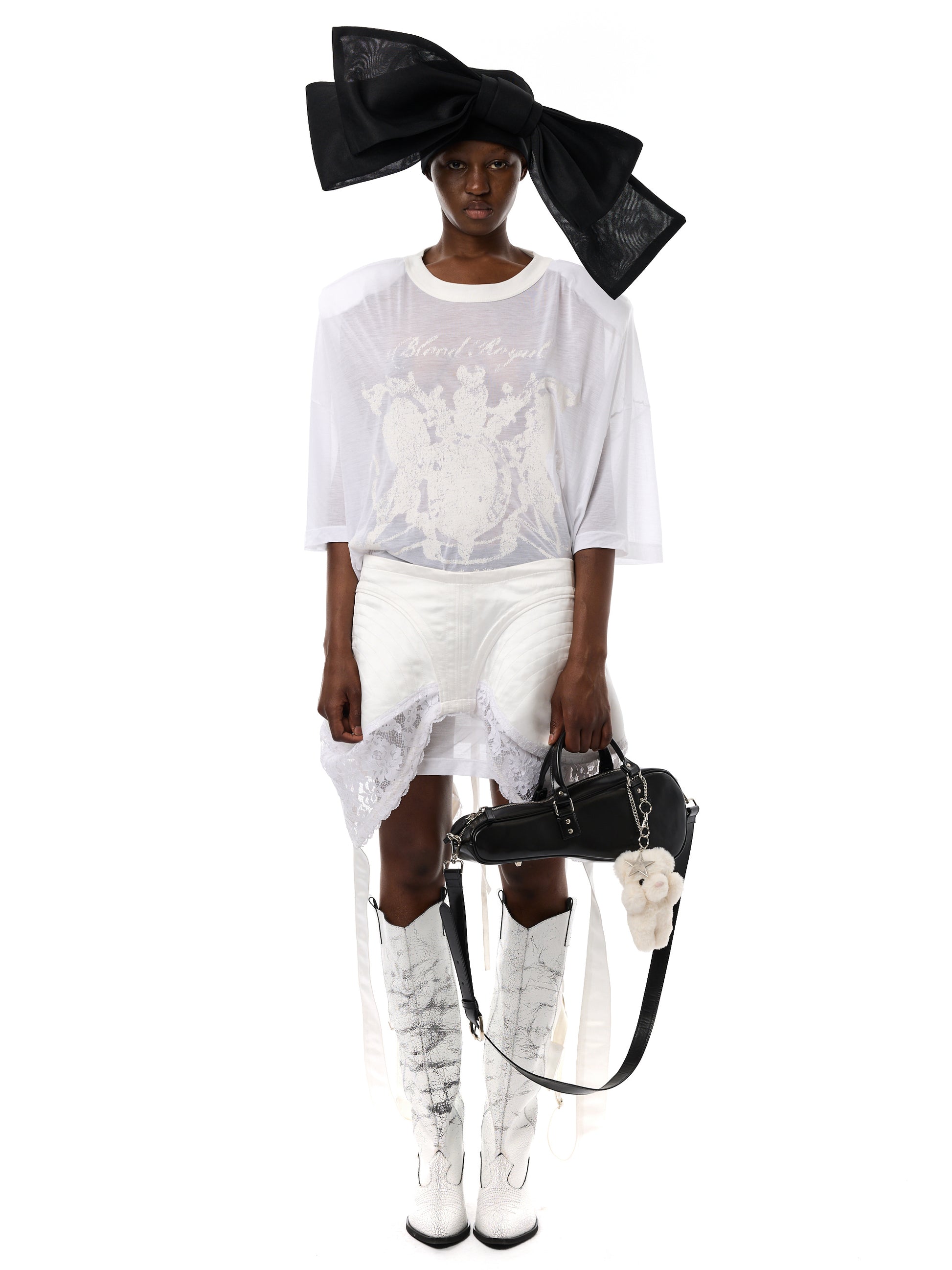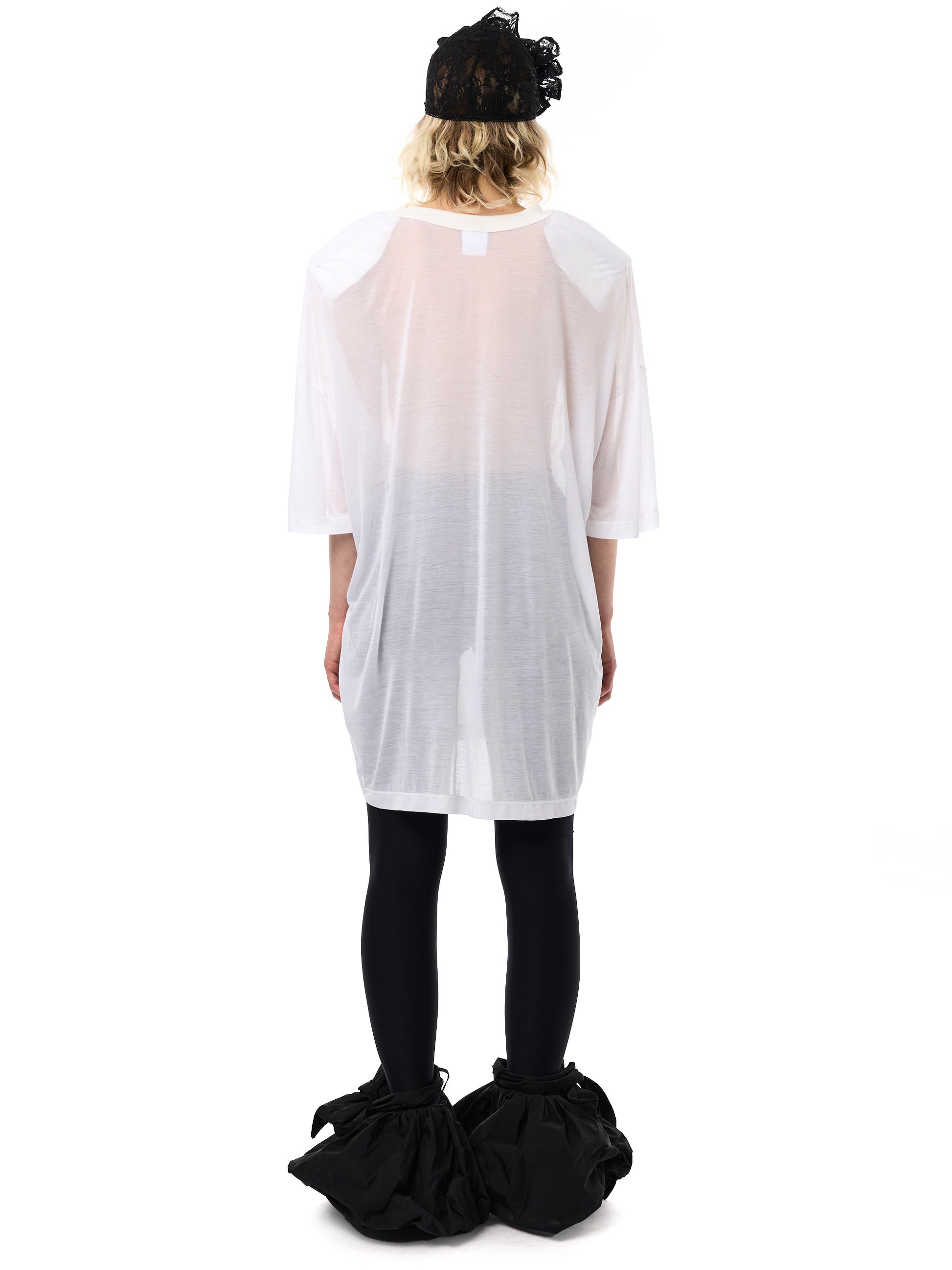 Sheer off white jersey tall tee with rib knit crewneck collar. Detachable shoulder pads and white graphic at front.