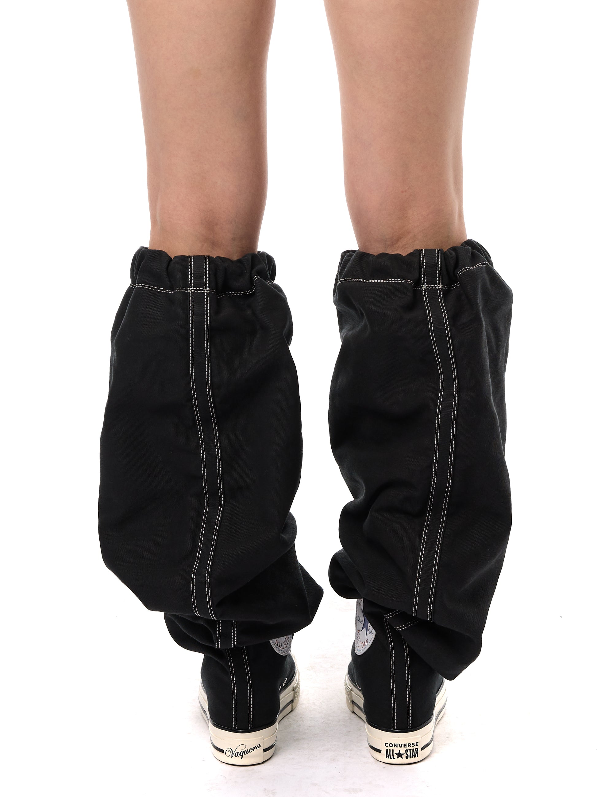 Vaquera X Converse. Waxed canvas slouchy knee high sneakers with internal wedge heel. Top lace and elastic webbing to cinch to leg. All star logo patch at ankles. White topstitching. Rubber outsole.