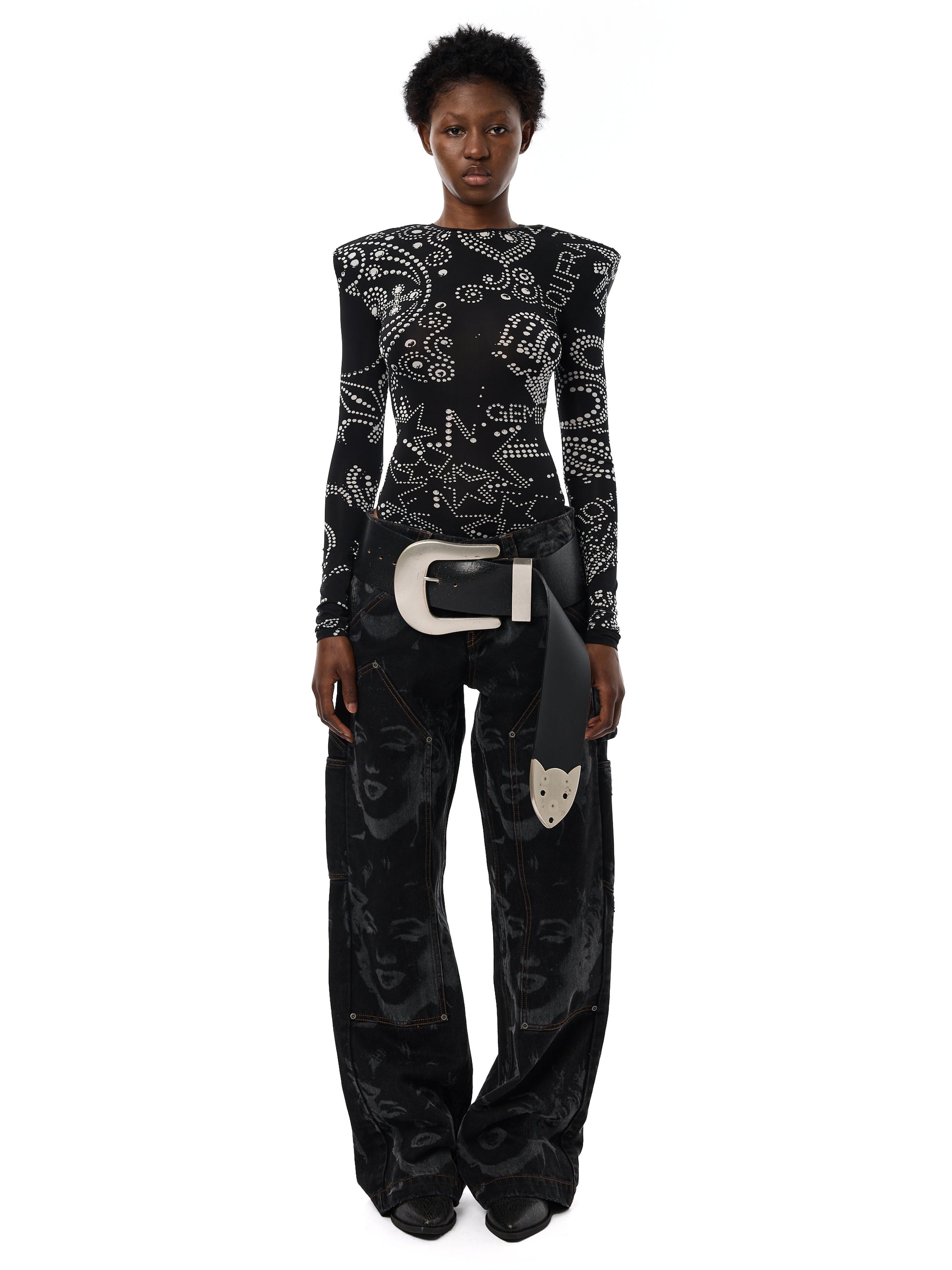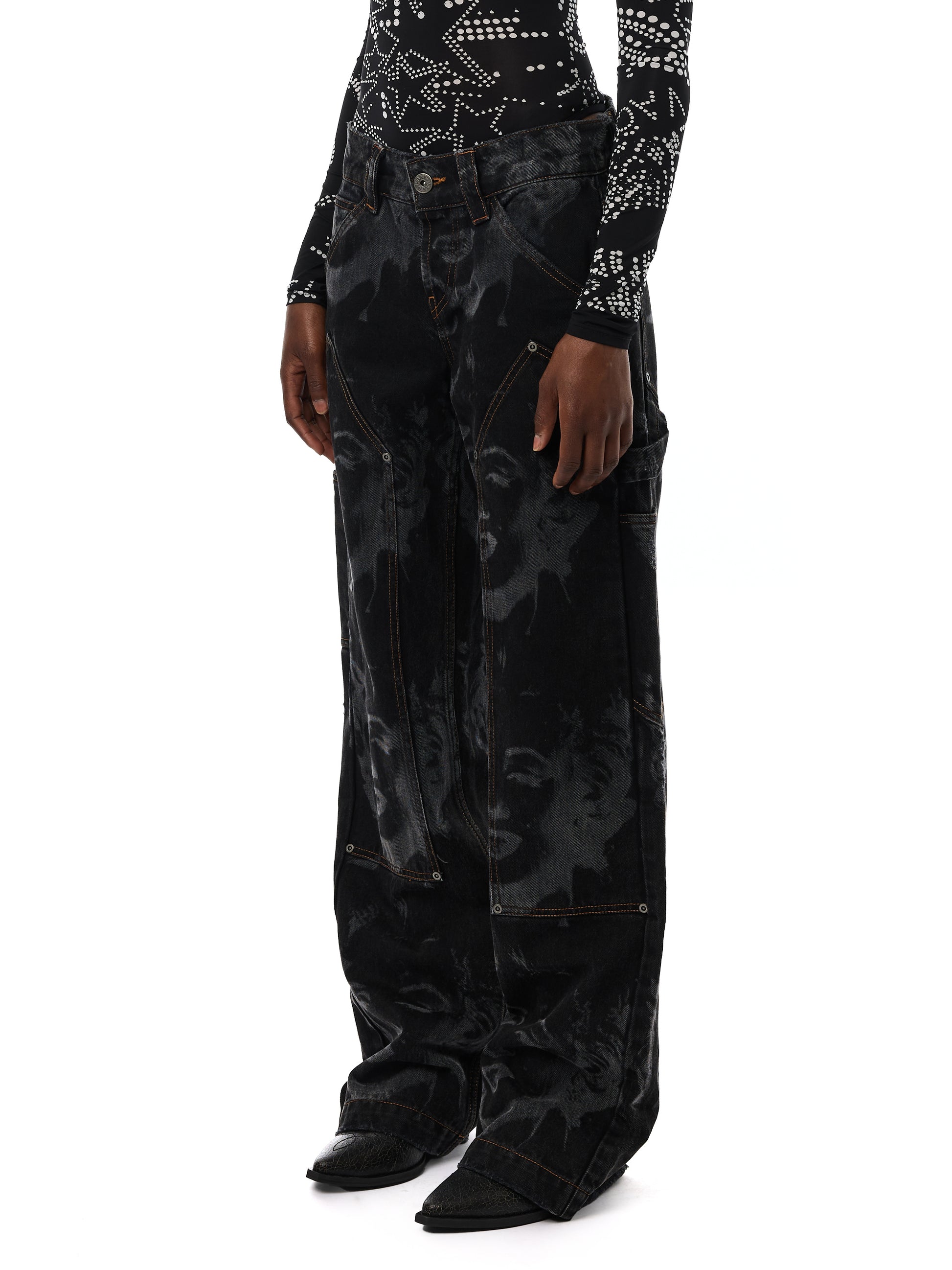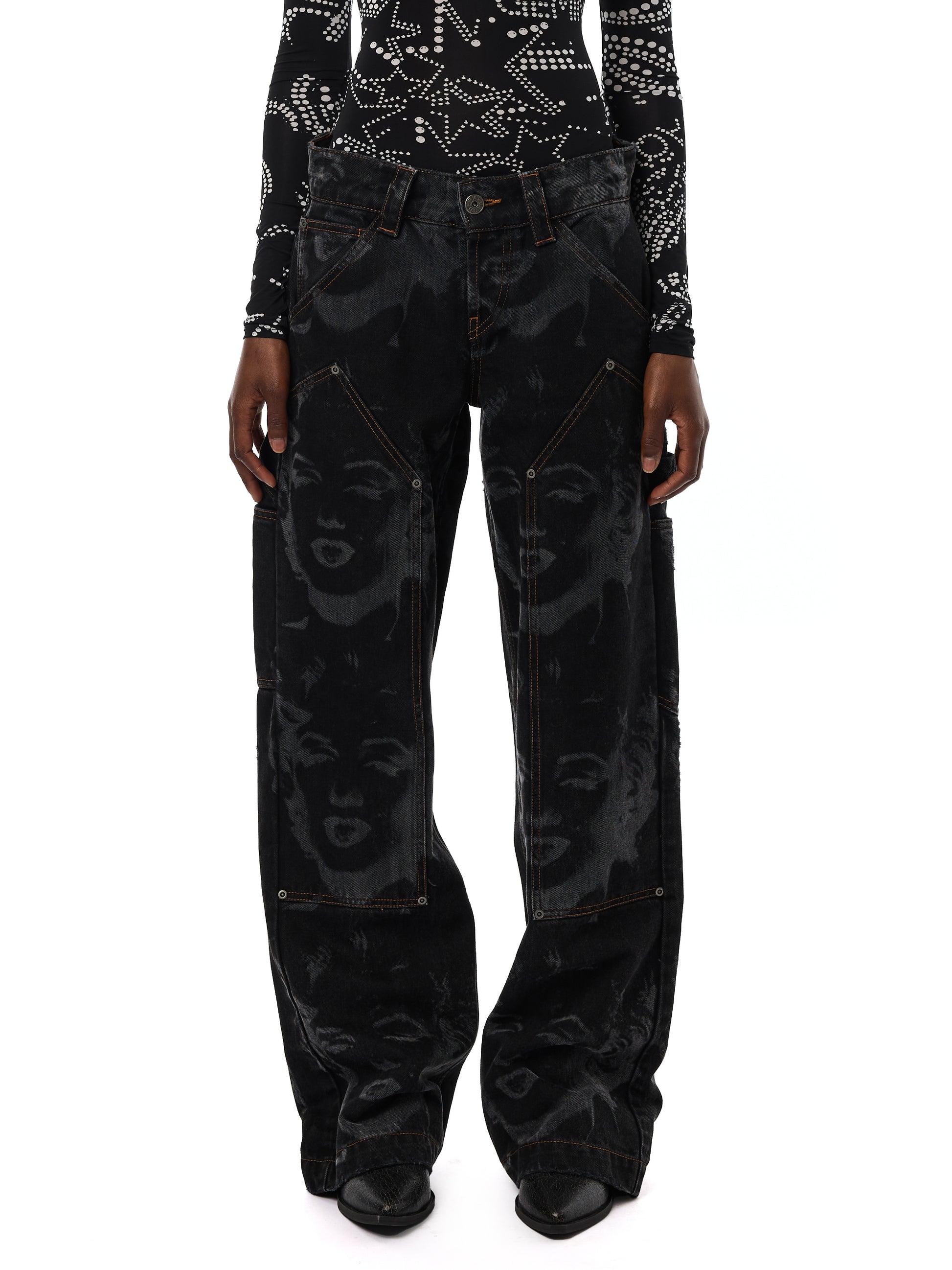 Low rise, loose straight leg fit workwear double knee jeans. Front, back and tool pockets and hammer loop. Belt loops at waistband and button and zip fly closure at front. Repeat Marilyn Monroe x Warhol graphic laser bleached on washed black denim.
